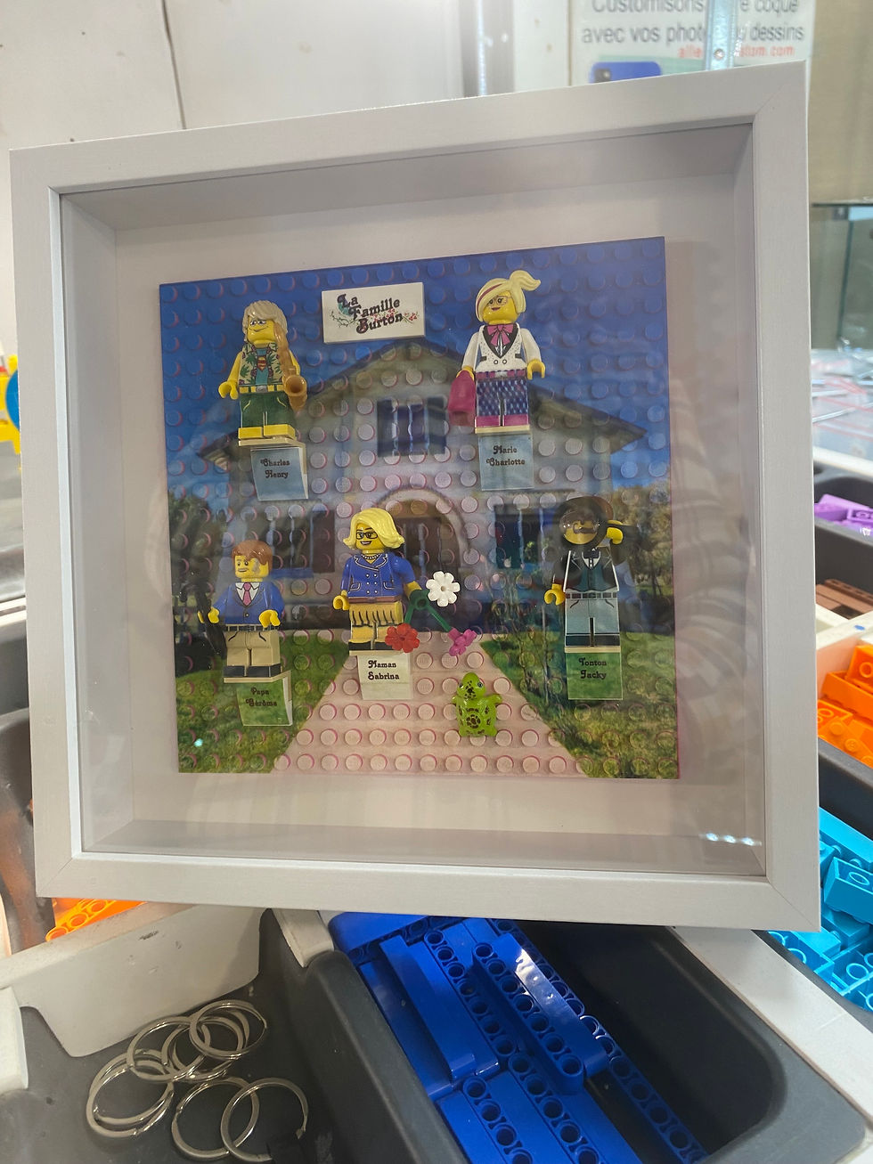 La famille, les amis, les collègues... La plaque du fond imprimée avec votre photo(19€). Les minifigures sont à commander sur le site. Elles sont crochetées sur un petit trépieds (2€) qui peut être personnalisé. Un til de 2x4 indiquera votre message (3€). Vitrine (21€) Devis complet sur demande.