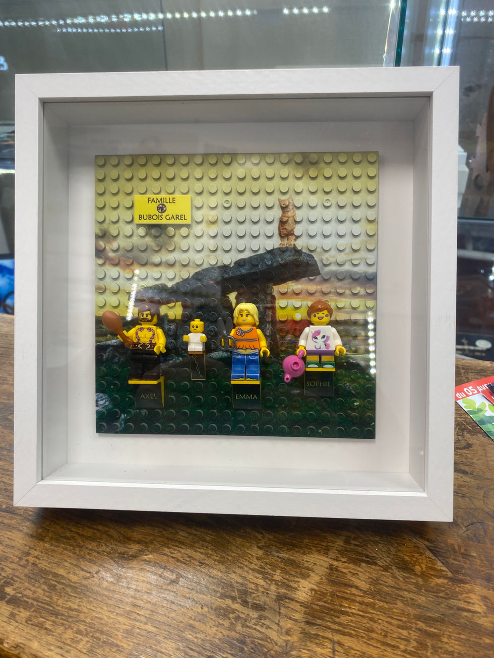 Plaque imprimée pour le fond, minifigures custom sur estrades. Cadres vitrine 20x20 cm. SUR DEVIS